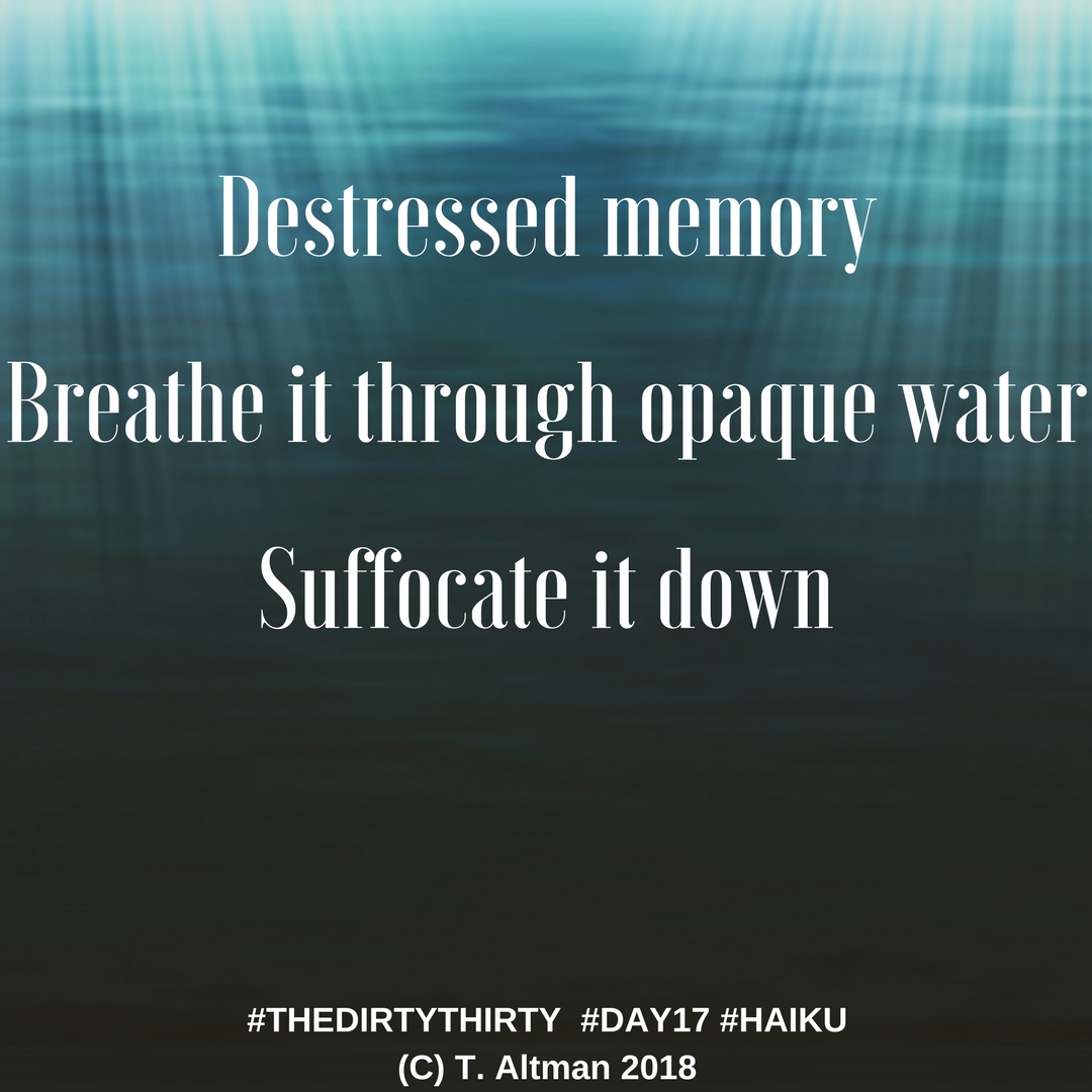 Poem: Depression Haiku (The Dirty Thirty: Day 17) April 19, 2018 ~ tinaaltman Share this: Click to share on X (Opens in new window) X Click to share on Facebook (Opens in new window) Facebook Like Loading... Related