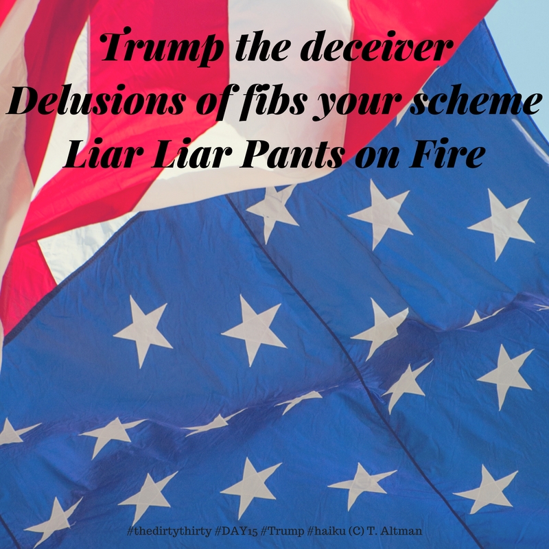 Poem: Trump (The Dirty Thirty: Day 15) April 19, 2018April 19, 2018 ~ tinaaltman Share this: Click to share on X (Opens in new window) X Click to share on Facebook (Opens in new window) Facebook Like Loading... Related