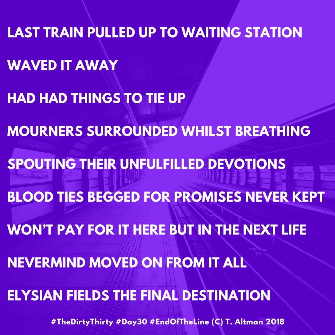 Poem: End of the Line (The Dirty Thirty: Day 30) May 4, 2018 ~ tinaaltman Share this: Click to share on X (Opens in new window) X Click to share on Facebook (Opens in new window) Facebook Like Loading... Related