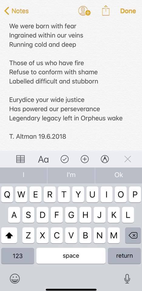 Poem: In Memory of Eurydice June 20, 2018 ~ tinaaltman I wrote this on my phone for Eurydice Dixon in honour of her memorial last night…. Share this: Click to share on X (Opens in new window) X Click to share on Facebook (Opens in new window) Facebook Like Loading... Related