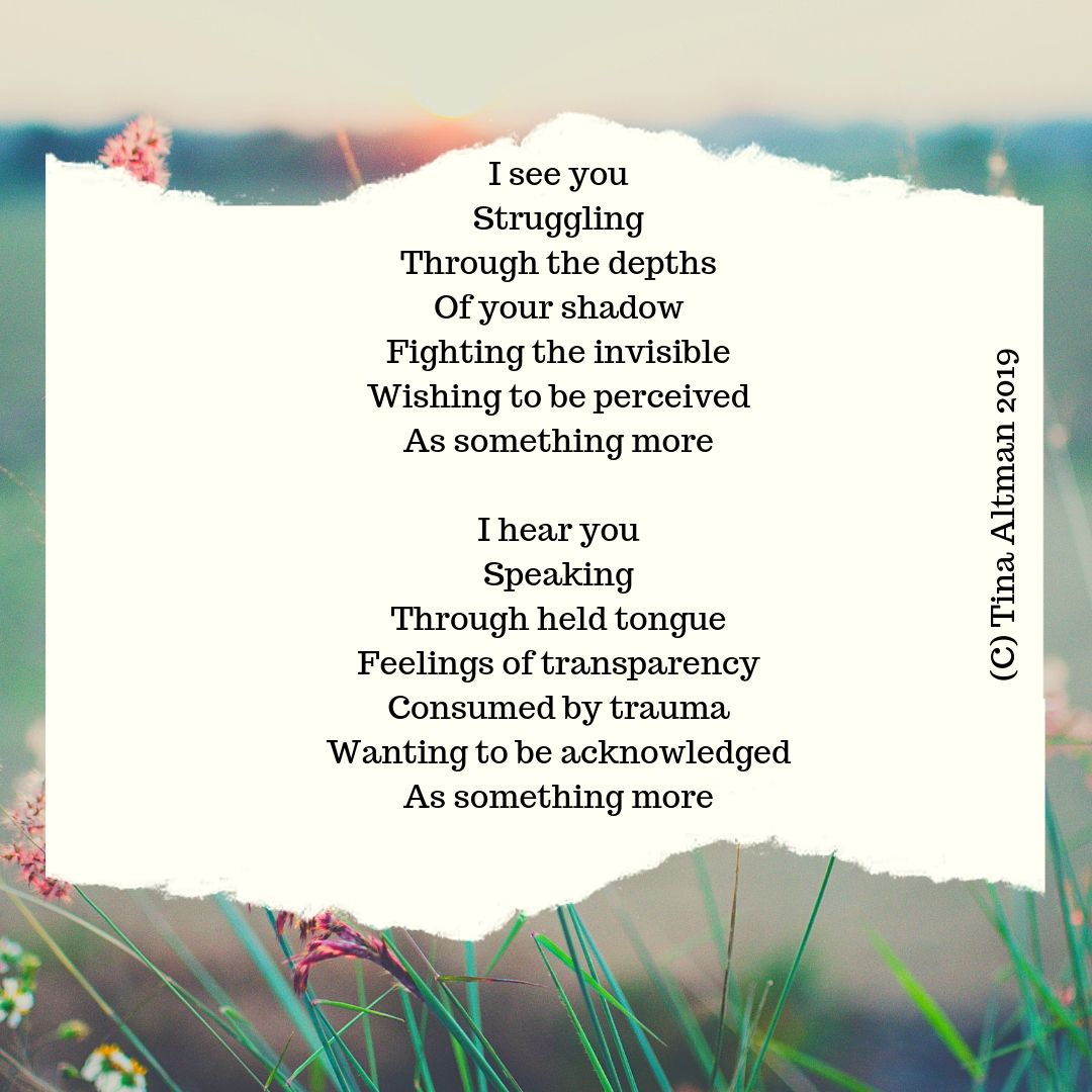 Poem: I See You, I Hear You Image ~ June 21, 2019 ~ tinaaltman Share this: Click to share on X (Opens in new window) X Click to share on Facebook (Opens in new window) Facebook Like Loading... Related