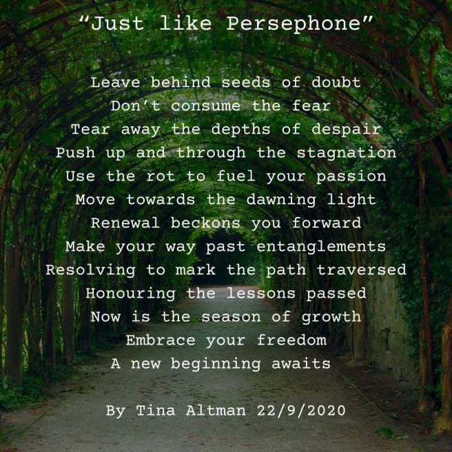 Poem: Just like Persephone Image ~ September 23, 2020 ~ tinaaltman Share this: Click to share on X (Opens in new window) X Click to share on Facebook (Opens in new window) Facebook Like Loading... Related
